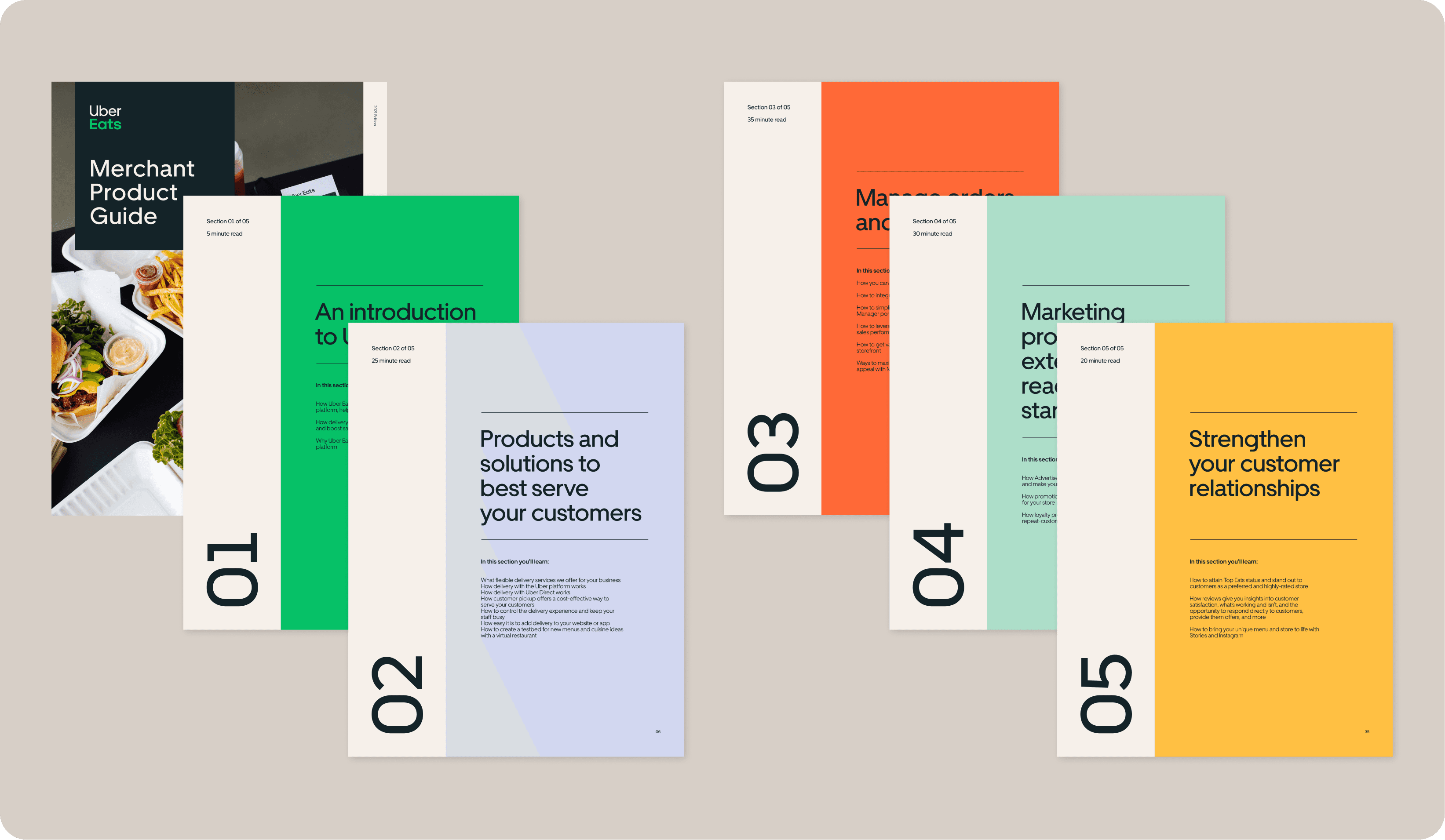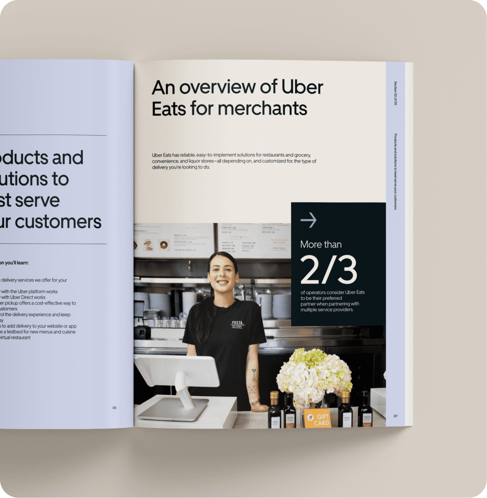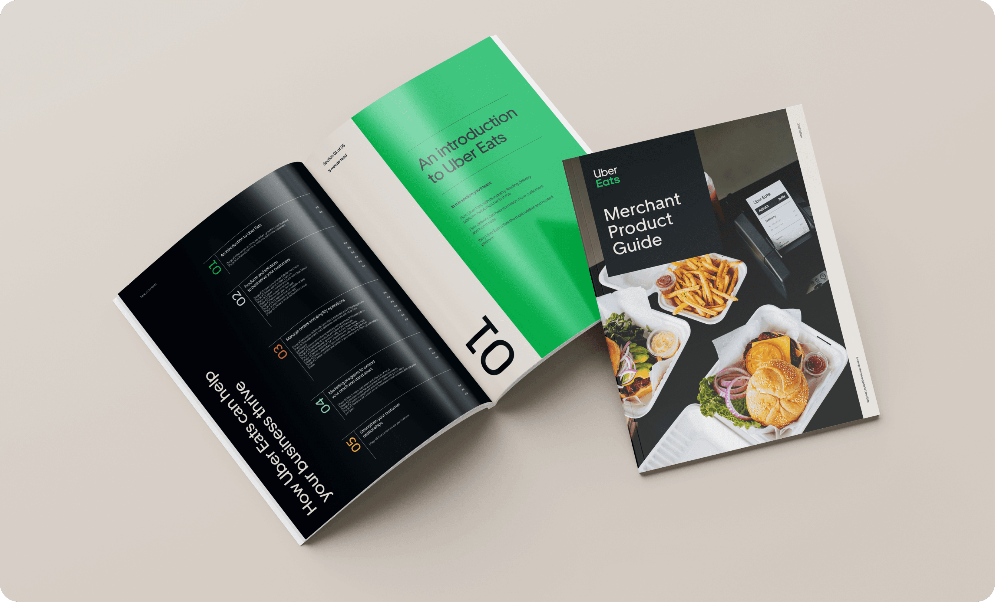 To create a centralized resource that better communicates Uber Eat's product offerings, we developed a comprehensive product guide for prospective merchant partners to make quicker, better informed decisions as they search for their next delivery platform.