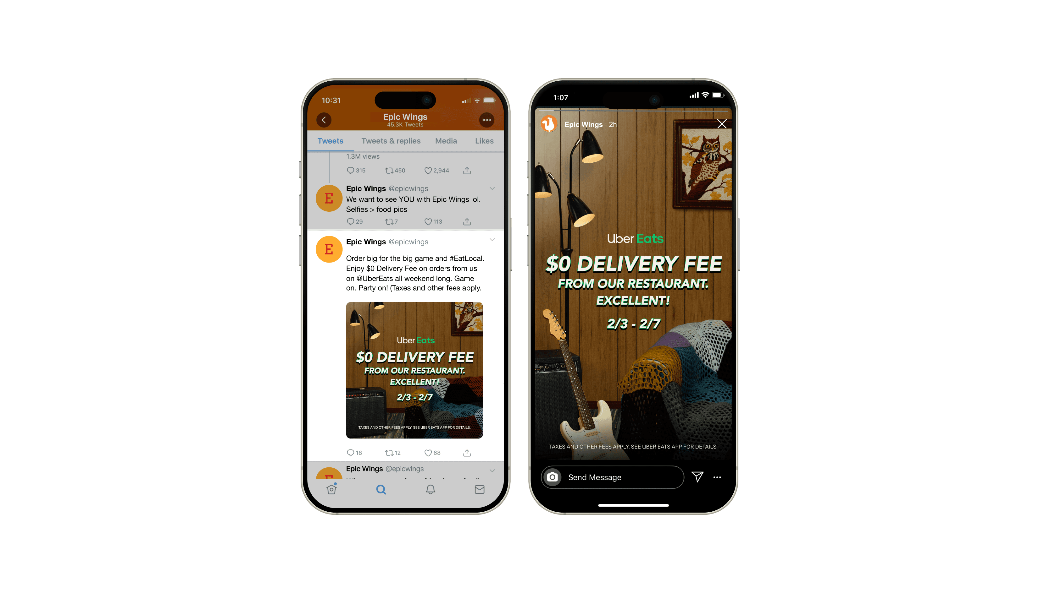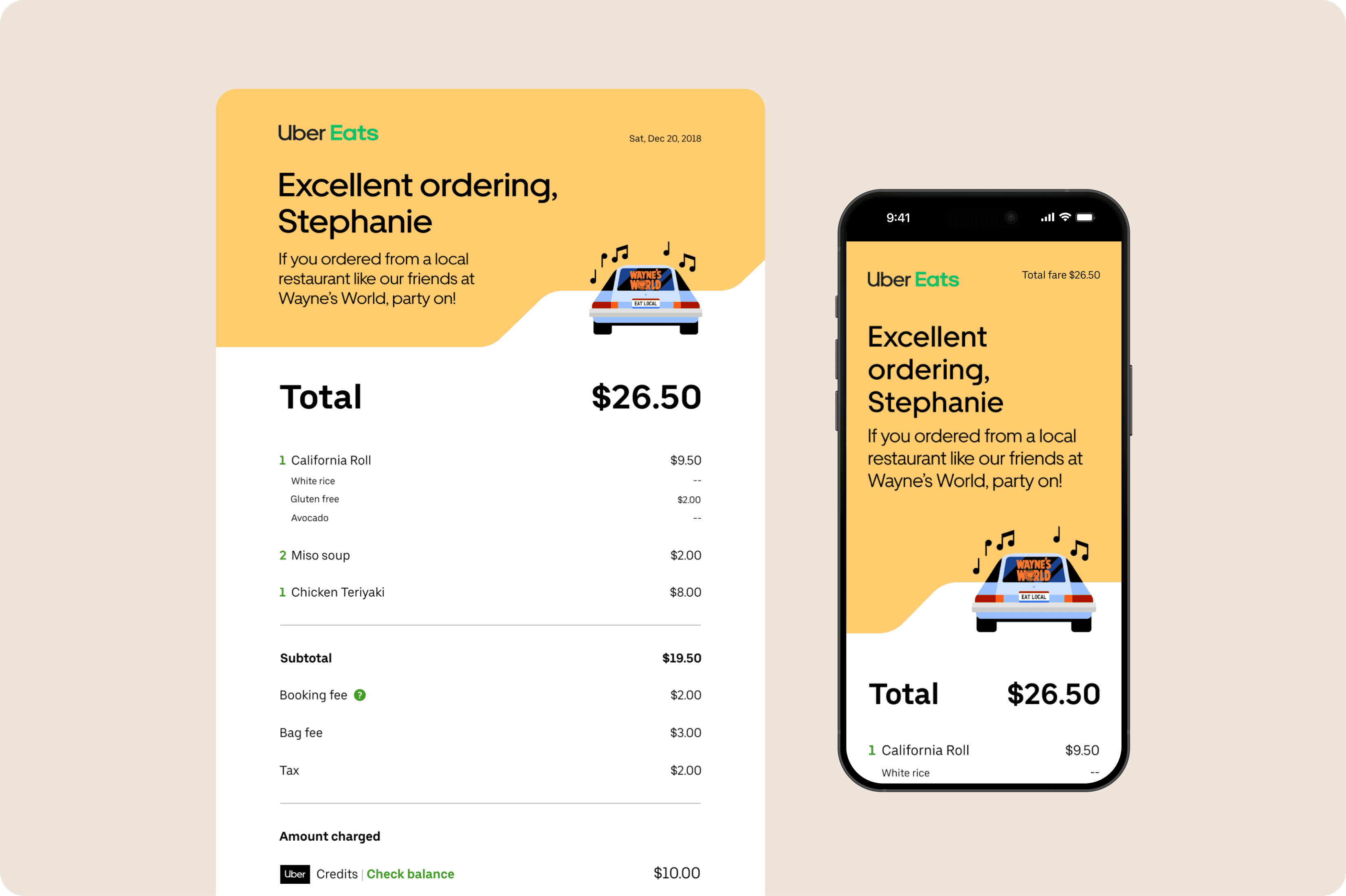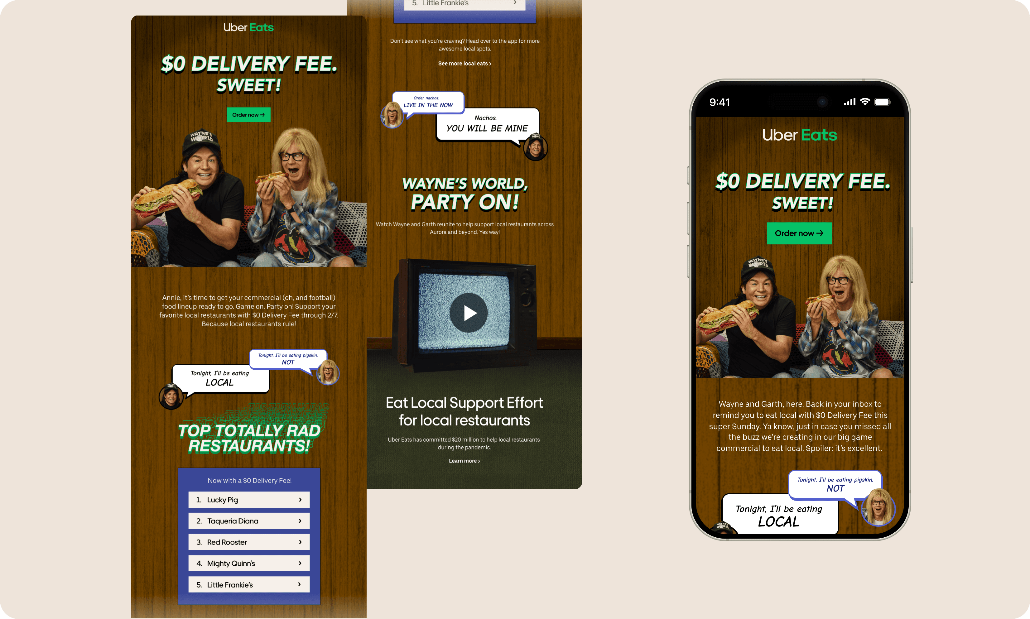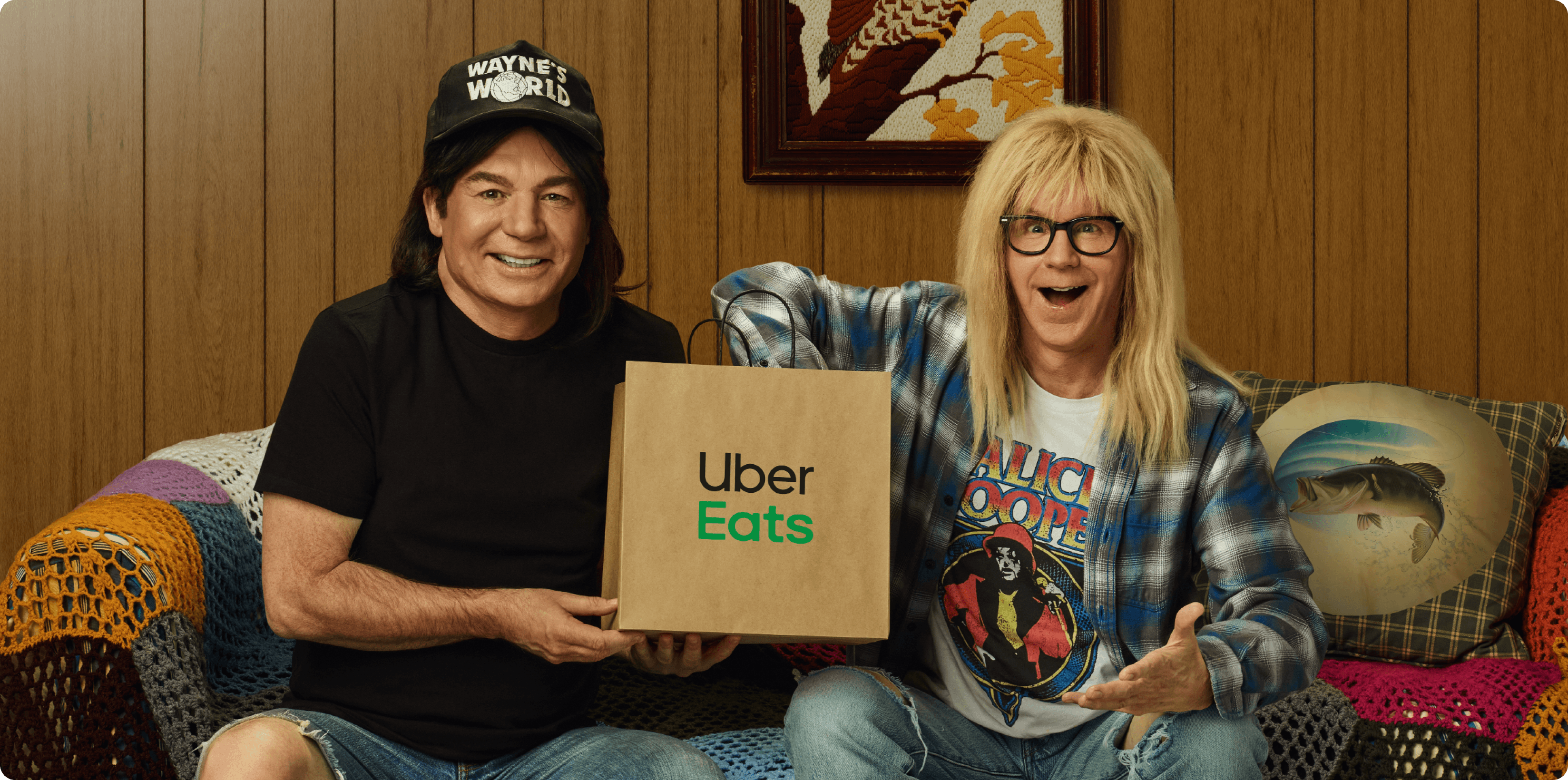 As Uber Eats prepares its first Super Bowl ad, we launched a integrated marketing campaign that centered around the Wayne's World duo, promoting local restaurants on the delivery platform.